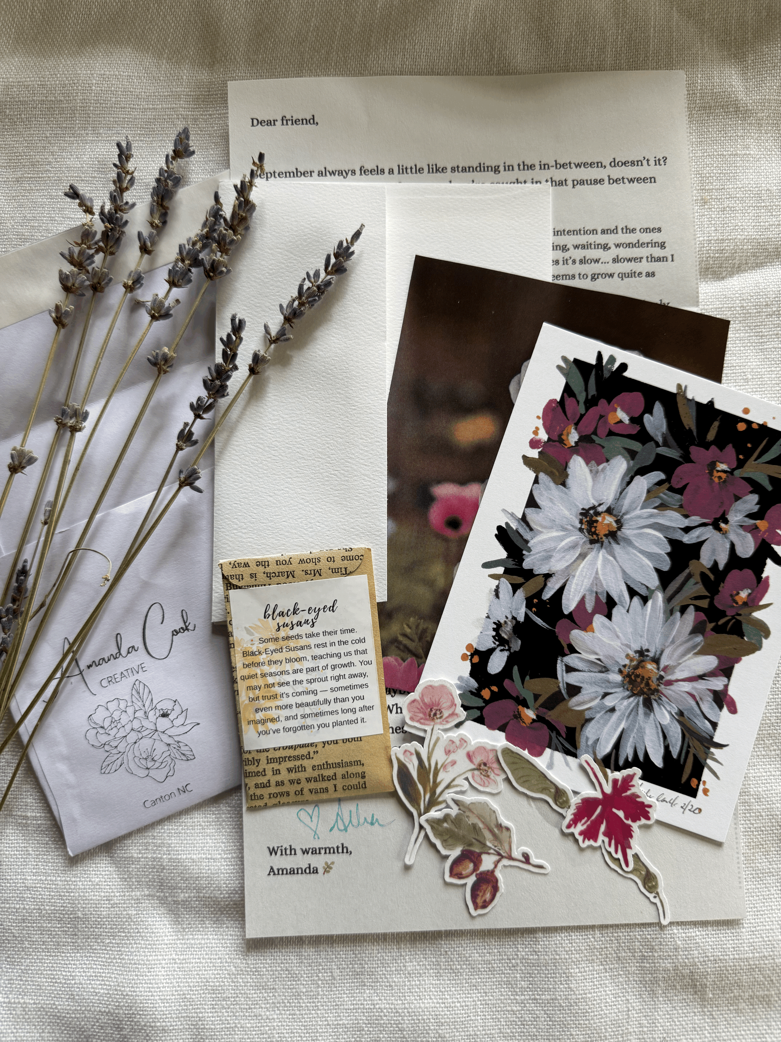 Where youโll find a small bundle of art and tenderness shipped to your door every month. Part letter, part keepsake, and part reminder that even in the hard seasons, beauty is still blooming. These mailers are filled with pieces Iโve painted, drawn, or written, and theyโre meant to feel like receiving something soft and thoughtful from a friend.